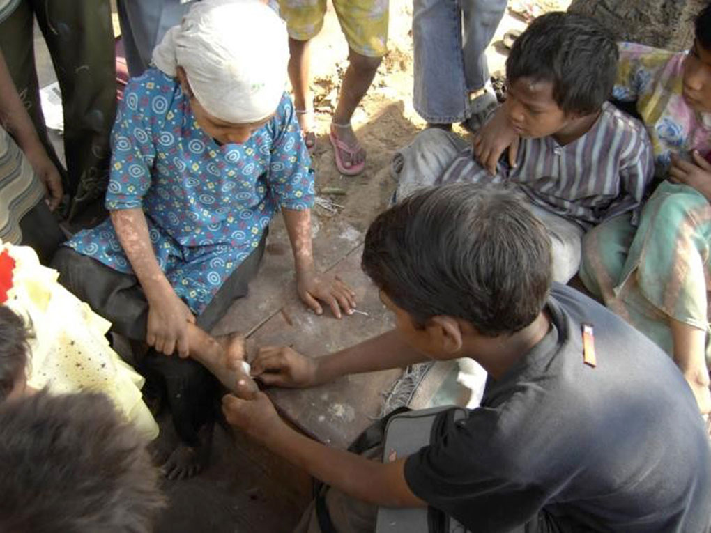 Da jedes Jahr Straßenkinder zu ErsthelferInnen ausgebildet und mit einer Behandlungstasche ausgestattet werden, können sie – wie im Bild rechts – kleinere Ver- letzungen anderer Straßenkinder behandeln.